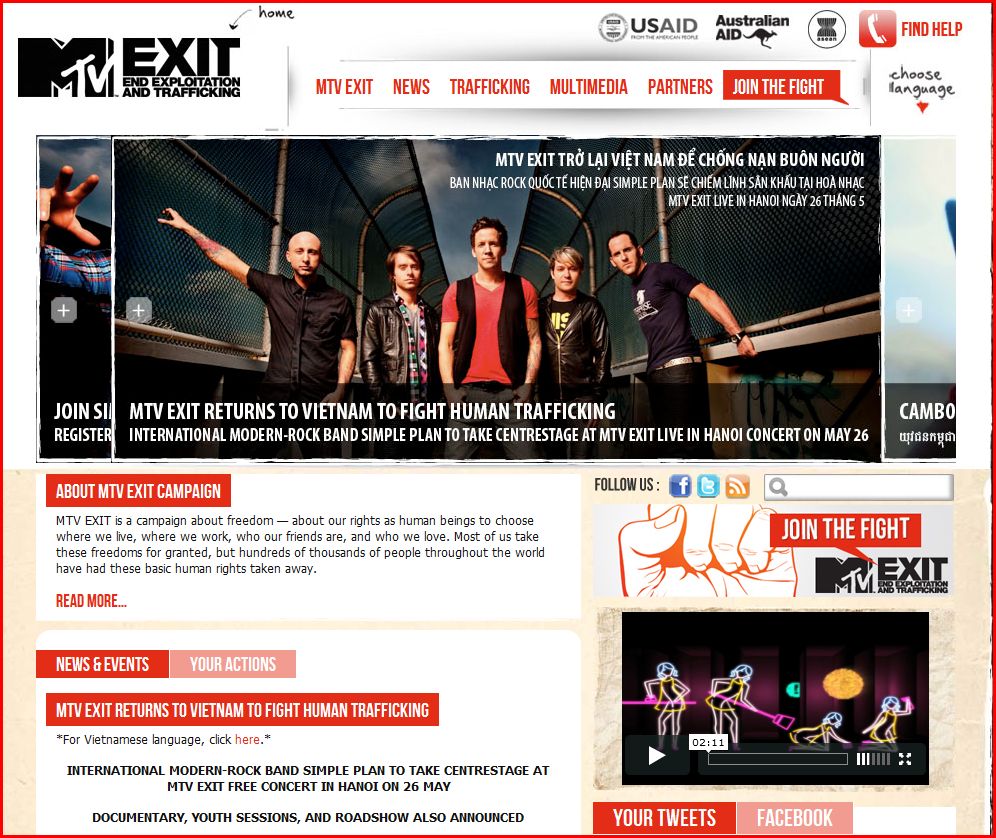 Formed to stop this worldwide scourge, MTV EXIT is a campaign about freedom which aims to increase the overall awareness and prevention of human trafficking. It does this through television programmes, online content, live events, and partnerships with anti-trafficking organizations. Working with a wide range of government agencies and NGOs, its partners include international bodies such as the UNIAP, World Vision, ASEAN, USAID (key partner), and AusAID (key partner).